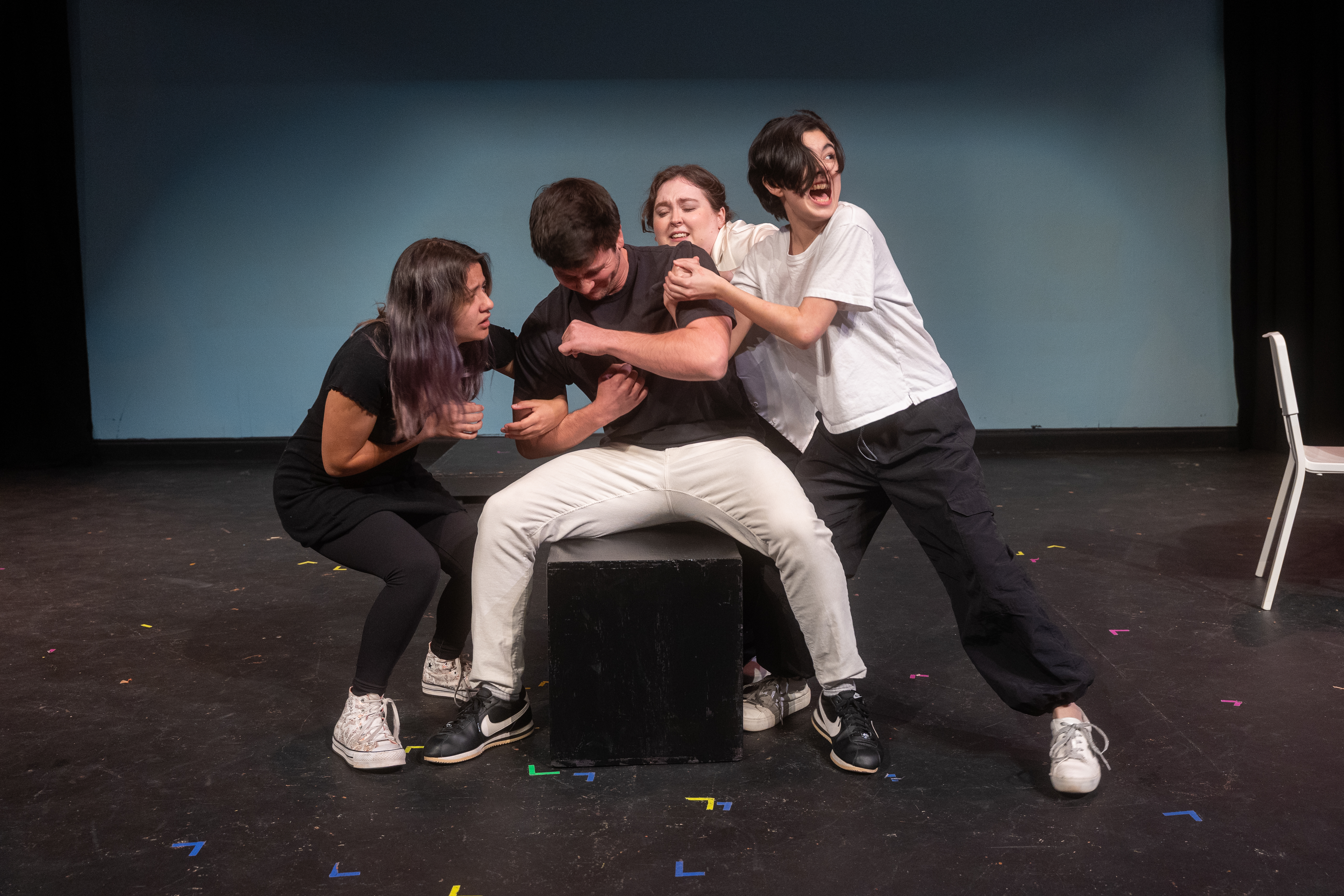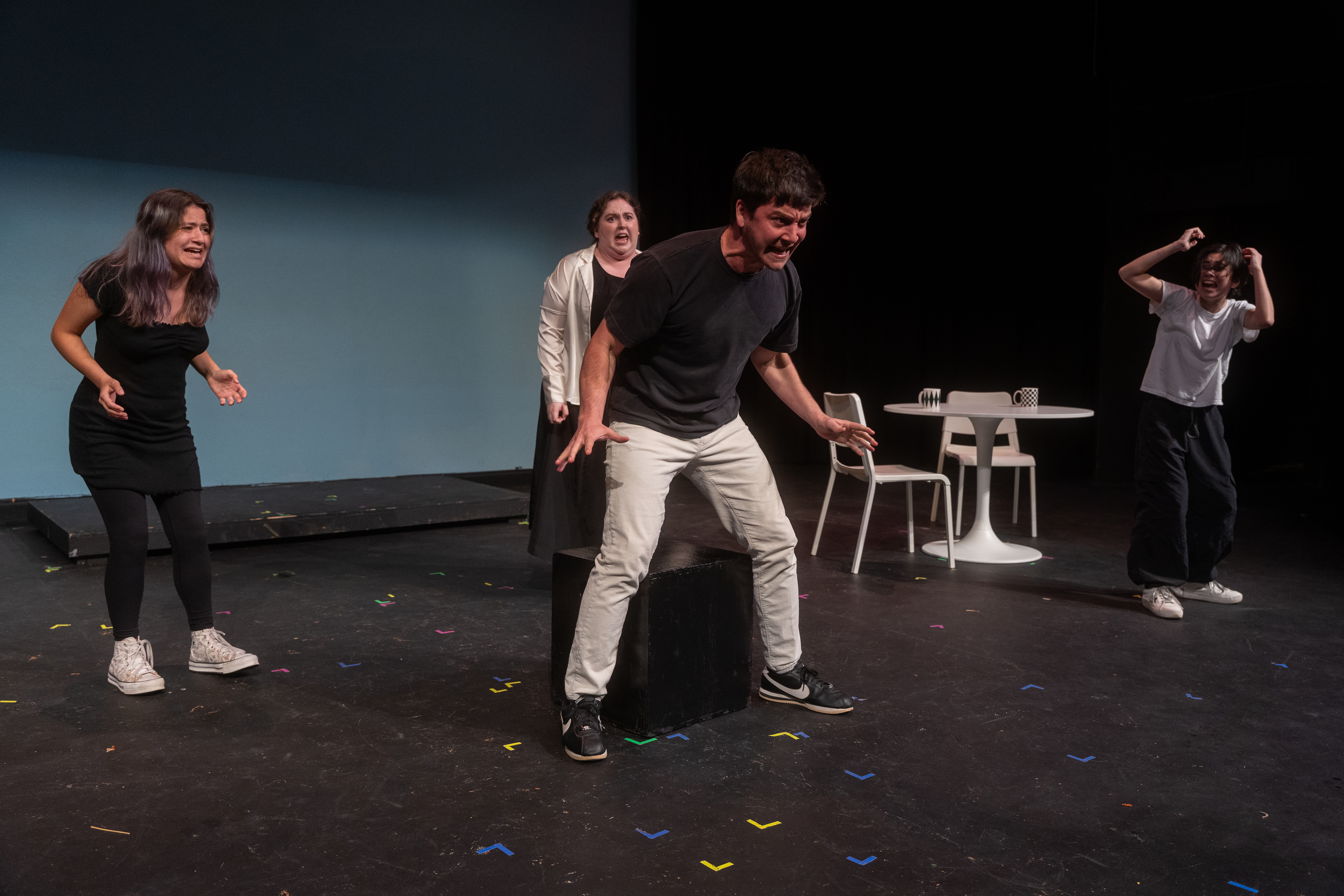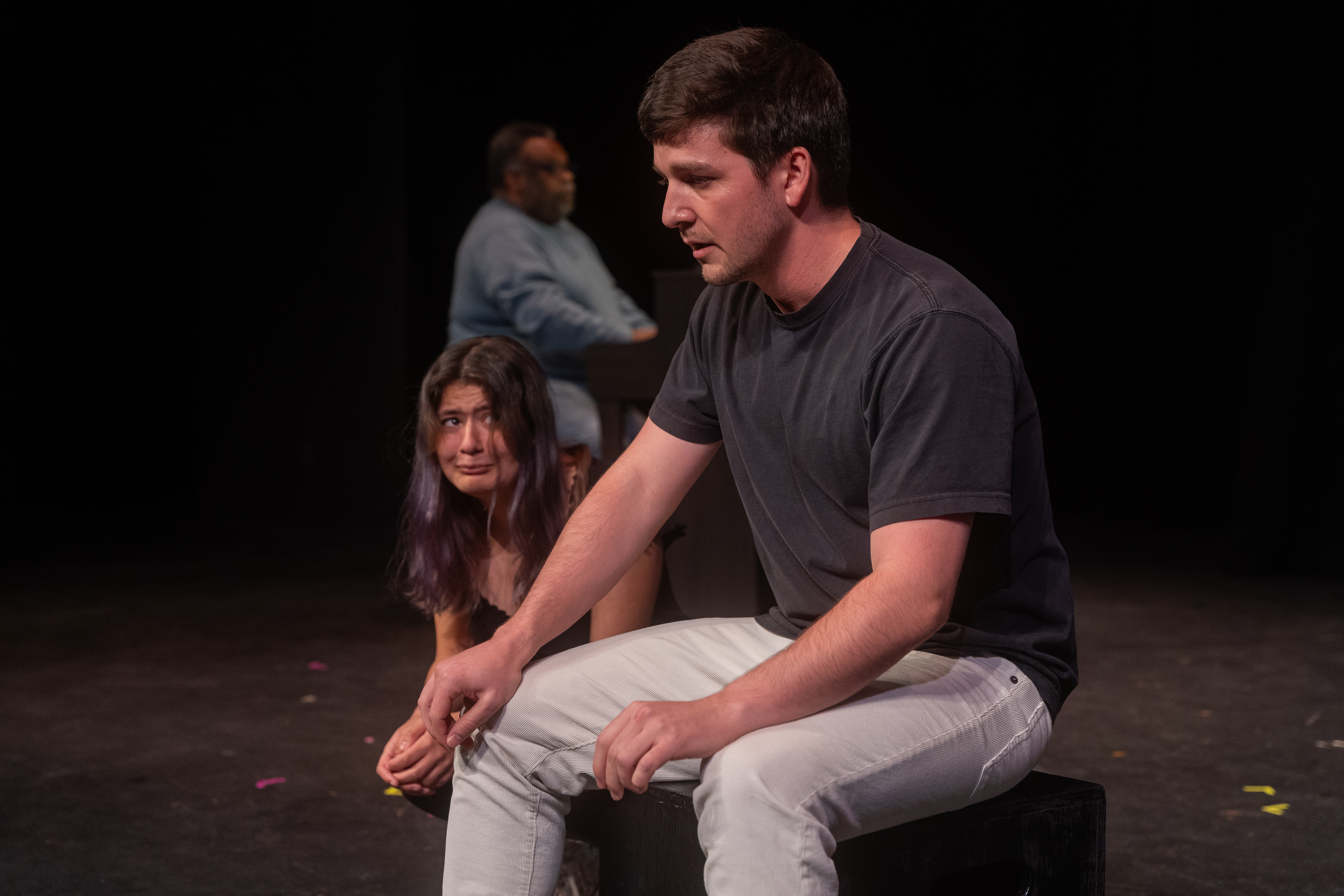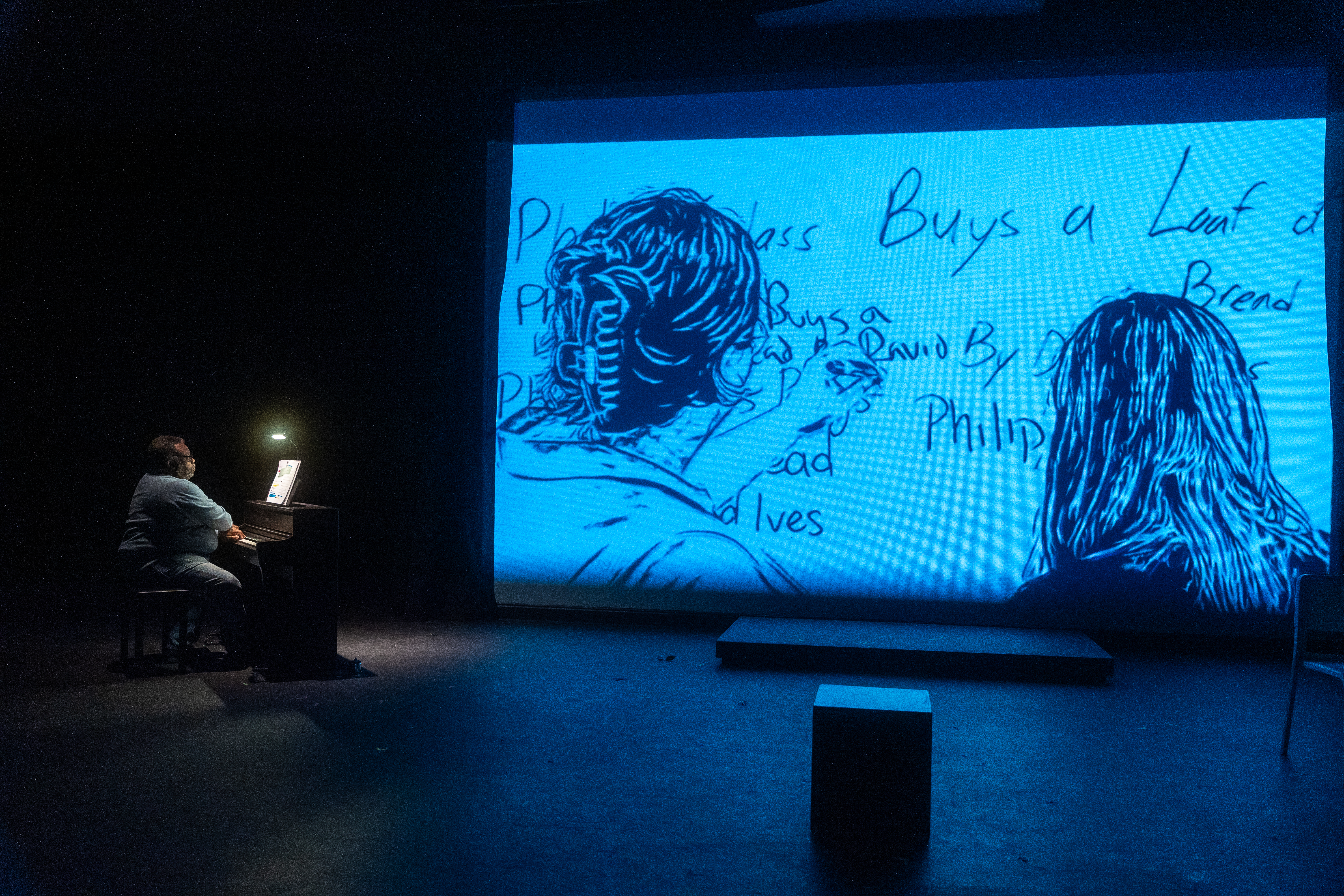 The concept for “Philip Glass Buys a Loaf of Bread,” by David Ives, included the addition of a pianist who played a counter melody to the action of the short play, as well as a series of video projections. The production appeared as part of the Short Plays Festival in Winter Theatre at Agnes Scott College in November, 2025.